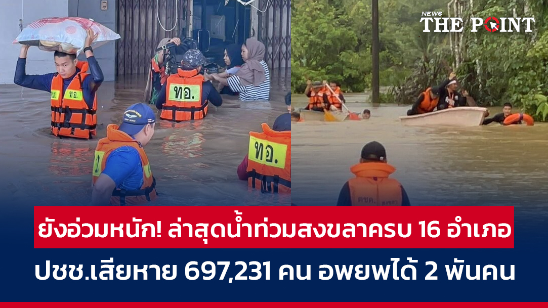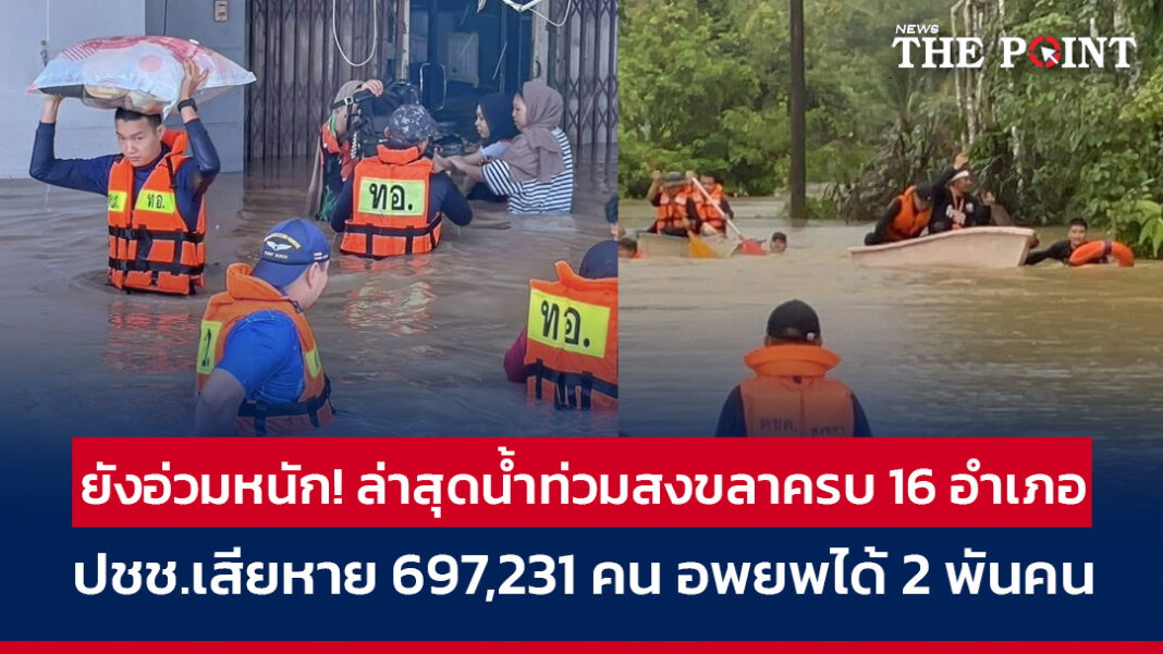 สงขลายังเผชิญน้ำท่วมรุนแรงทุกอำเภอ กระทบกว่า 697,000 คน ต้องอพยพกว่า 2,000 คน หน่วยงานรัฐระดมกำลังช่วยเหลือเต็มรูปแบบ เปิดศูนย์พักพิง 3 จุด ใช้เรือ รถยกสูง และเครื่องสูบน้ำจำนวนมาก คาดฝนยังหนักต่อเนื่องถึง 25 พ.ย. ก่อนมรสุมเริ่มอ่อนลง